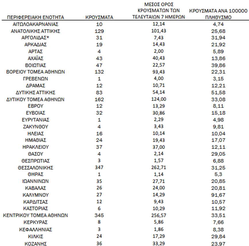 * Στην Π.Ε. Αργολίδας περιλαμβάνονται κρούσματα προηγούμενου χρονικού διαστήματος λόγω καθυστερημένης δήλωσης στο Μητρώο Covid-19