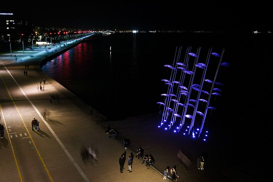 Στο χρώμα του πένθους φωτίστηκαν χθες, Μεγάλη Παρασκευή , οι «Ομπρέλες» του Γιώργου Ζογγολόπουλου, στη νέα παραλία της Θεσσαλονίκης. Το εμβληματικό γλυπτό φωτίστηκε με μωβ χρώμα, στο πλαίσιο μιας συμβολικής κίνησης από την πλευρά του Δήμου Θεσσαλονίκης για τις ημέρες του Πάσχα.