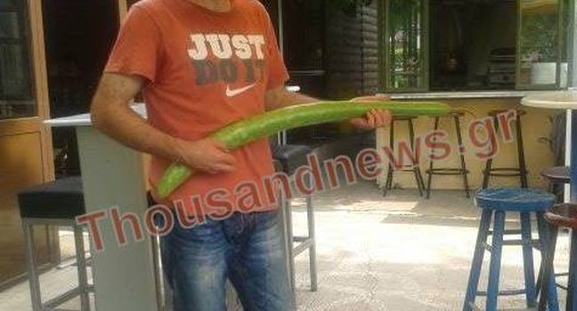 Ένα.. αγγούρι που ξεπερνάει το ένα μέτρο έγινε θέμα συζήτησης για τους θαμώνες του αναψυκτηρίου στο κέντρο του χωριού. Όλοι έσπευσαν να το δουν και να σχολιάσουν για το μέγεθός του. Μάλιστα δεν έλειψαν και εκείνοι που μπήκαν στη διαδικασία να το ονοματίσουν χρησιμοποιώντας ακόμα και το επίθετο… «ΜΕΓΑ».