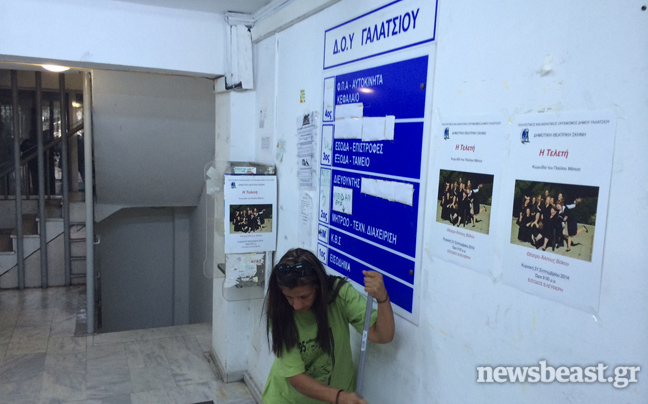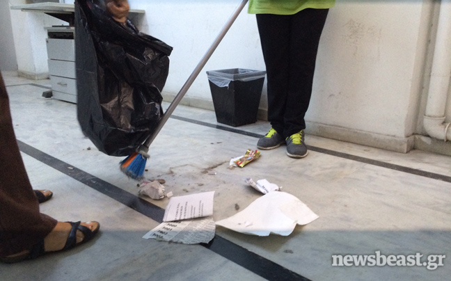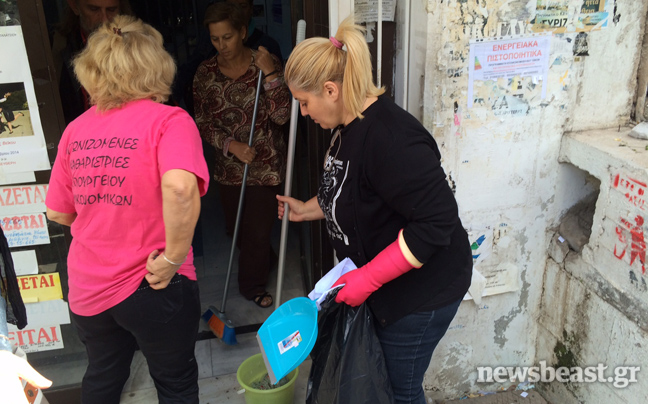 Η προϊσταμένη αρχή, ωστόσο, δεν τους επέτρεψε να φτάσουν στους ορόφους του κτιρίου και αρκέστηκαν στο να καθαρίσουν μονάχα την είσοδο.
