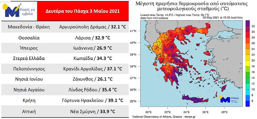 Στην Κρήτη, την Πελοπόννησο και την Αττική, η θερμοκρασία σημείωσε περαιτέρω άνοδο σε σχέση με την Κυριακή του Πάσχα, με την υψηλότερη μέγιστη θερμοκρασία να καταγράφεται στη Γόρτυνα Ηρακλείου Κρήτης με 39,1 βαθμούς Κελσίου.