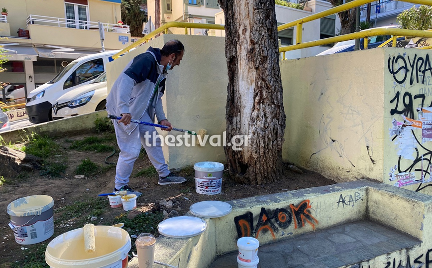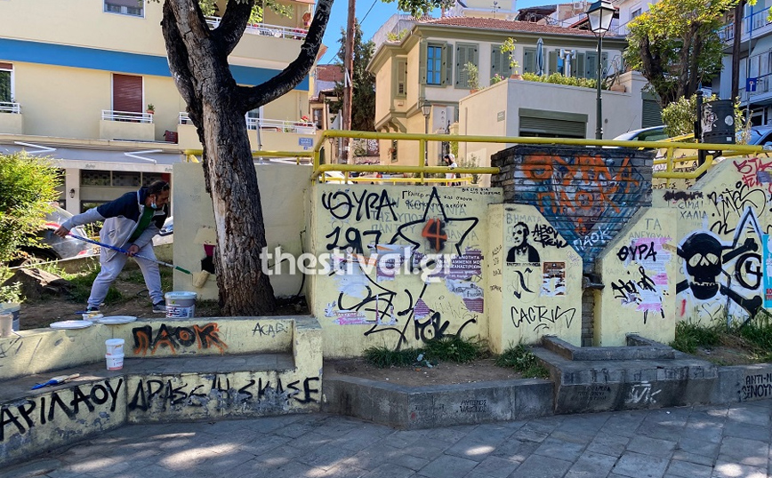 Από νωρίς το πρωί της Πέμπτης συνεργείο της διεύθυνσης αρχιτεκτονικού του Δήμου Θεσσαλονίκης βάφει τις λερωμένες επιφάνειες της πλατείας Καλλιθέας.