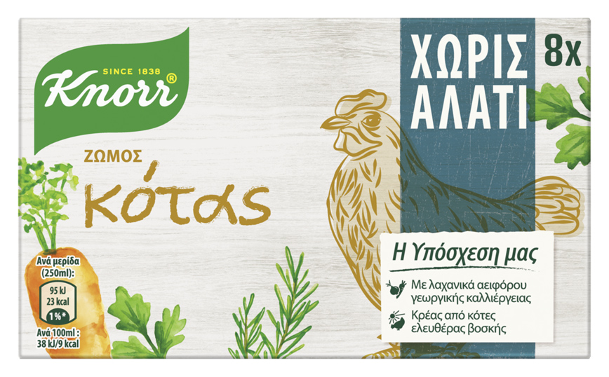 Οι κύβοι Knorr χωρίς αλάτι διατίθενται σε τρεις υπέροχες γεύσεις (κότας, λαχανικών και για βοδινό) και είναι φτιαγμένοι από ένα μοναδικό μείγμα λαχανικών, μυρωδικών και καρυκευμάτων, όπως δεντρολίβανο, μοσχοκάρυδο και κουρκουμά. Είναι πλούσιοι σε γεύση με λαχανικά αειφόρου γεωργικής καλλιέργειας, με κρέας από κότες ελευθέρας βοσκής & κρέας βοδινού από αειφόρες κτηνοτροφικές μονάδες. Δεν περιέχουν γλουτένη, τεχνητά ενισχυτικά γεύσης και άλλες τεχνητές χρωστικές. Απευθύνονται σε εκείνους που προσέχουν το αλάτι για λόγους υγείας, που επιλέγουν την υγιεινή διατροφή και την σωματική άσκηση, αλλά και στις μαμάδες που μαγειρεύουν υγιεινά και θρεπτικά για τα παιδιά και για όλη την οικογένεια.