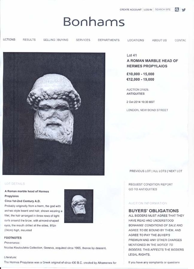 Συναγερμός σήμανε στο υπουργείο Πολιτισμού, όταν κατά τη διάρκεια ελέγχου που πραγματοποιήθηκε από τη Διεύθυνση Τεκμηρίωσης και Προστασίας Πολιτιστικών Αγαθών την πρώτη ημέρα ανάρτησης (10 Σεπτεμβρίου 2014) του ηλεκτρονικού καταλόγου της δημοπρασίας Αρχαιοτήτων που πρόκειται να πραγματοποιηθεί στο Λονδίνο στις 2 Οκτωβρίου 2014 (Auction 21928, Antiquities), στον ιστότοπο του Οίκου Δημοπρασιών Bonhams, διαπιστώθηκε ότι στα προς δημοπράτηση αντικείμενα περιλαμβάνεται και μαρμάρινη κεφαλή Ερμή.