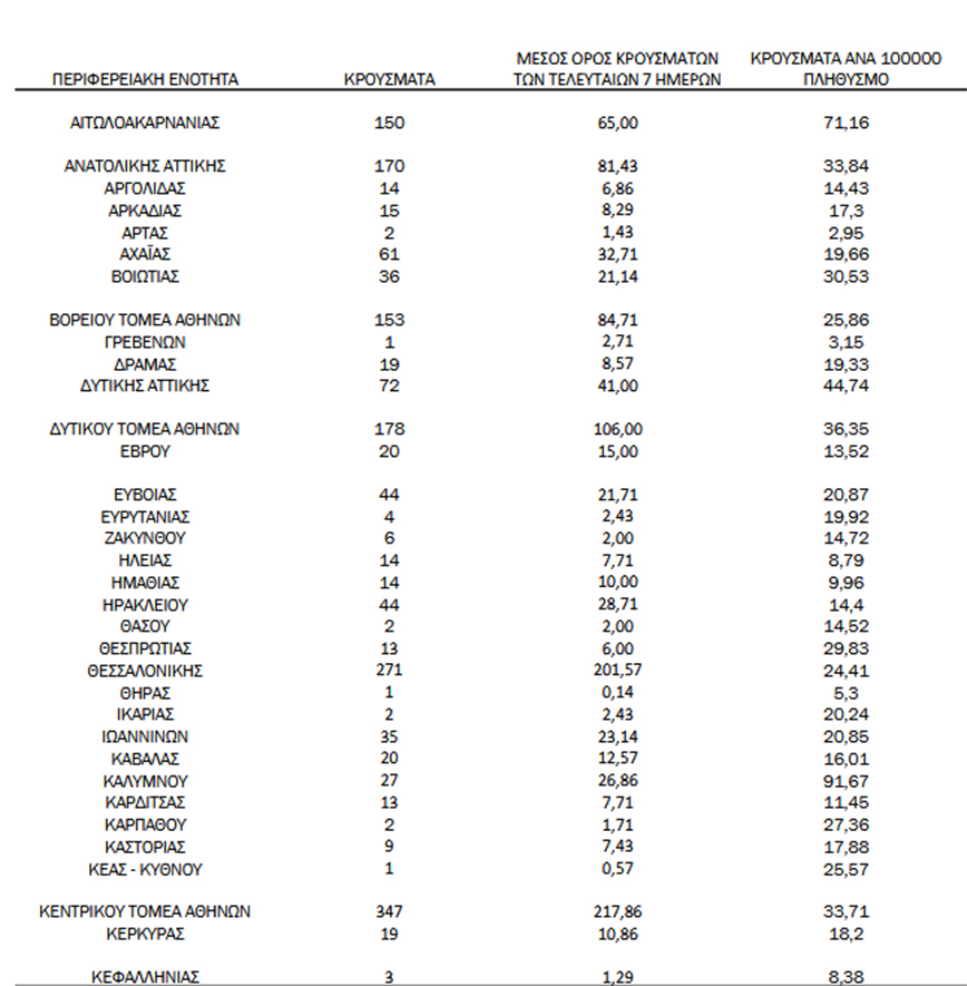 Συγκεκριμένα η Αττική έχει 1.245 νέα κρούσματα, η Θεσσαλονίκη 271, ενώ στο «κόκκινο» βρίσκεται η Αιτωλοακαρνανία με 150 περιστατικά covid-19.