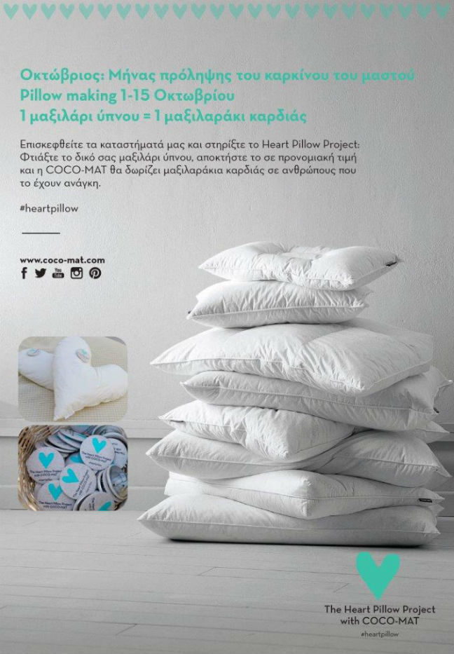 Από την 1η έως τις 15 Οκτωβρίου, η COCO-MAT διοργανώνει σε όλα της τα καταστήματα pillow making events και σας προσκαλεί να φτιάξετε το δικό σας προσωπικό μαξιλάρι ύπνου. Κατά την διάρκεια των pillow making event, oι συμμετέχοντες θα έχουν την ευκαιρία, όχι μόνο να παρακολουθήσουν «εξ επαφής» τη διαδικασία κατασκευής των μαξιλαριών μας, αλλά και να συμβάλουν ενεργά σ’ αυτήν, μαθαίνοντας, μάλιστα, τα μυστικά – και τα φανερά – που καθιστούν ένα μαξιλάρι ιδανικό και αναντικατάστατο για τον κάθε χρήστη ξεχωριστά. Φυσικά υλικά, σε αφθονία, θα βρίσκονται στη διάθεσή σας, για να συνθέσετε μ’ αυτά, αλλά, φυσικά, και με την καθοδήγηση και τη βοήθεια των ανθρώπων μας, το δικό σας μαξιλάρι. Οι ενδιαφερόμενοι μέσω του pillow making θα μπορούν να στηρίξουν τo heart pillow project μέσω των αγορών τους, όπου για κάθε ένα μαξιλάρι ύπνου που θα πωλείται σε προνομιακή τιμή, η COCO-MAT θα δωρίζει ένα μαξιλαράκι καρδιάς σε όσους αντιμετωπίζουν τον καρκίνο του μαστού. Videos για το heart pillow project with COCO-MAT www.coco-mat.com www.facebook.com/coco-mat.gr Tο heart pillow project Η COCO-MAT υποστηρίζει για 3η συνεχόμενη χρονιά τους ανθρώπους που έχουν αντιμετωπίσει τον καρκίνο του μαστού, προσφέροντας δωρεάν μαξιλαράκια σε σχήμα καρδιάς. Από το 2012, η COCO-MAT έχει προσφέρει 2.500 μαξιλαράκια καρδιάς σε δημόσια νοσοκομεία και κέντρα μαστού στην Ελλάδα και το εξωτερικό. Για το έτος 2014-2015 η προσπάθεια της COCO-MAT εξαπλώνεται σε περισσότερες χώρες και νοσοκομεία. Πιο συγκεκριμένα στην Ελλάδα θα προσφέρει μαξιλαράκια καρδιάς σε 7 δημόσια νοσοκομεία, όπως τα: Γενικό Αντικαρκινικό Ογκολογικό Νοσοκομείο «Αγ. Σάββας», Γενικό Ογκολογικό Νοσοκομείο Κηφισιάς «Αγ. Ανάργυροι», Γενικό Νοσοκομείο Αθηνών «ΙΠΠΟΚΡΑΤΕΙΟΝ», Πανεπιστημιακό Αντικαρκινικό Γενικό Νοσοκομείο Ηρακλείου (Π.Α.Γ.Ν.Η.), Ειδικό Αντικαρκινικό Νοσοκομείο Πειραιάς «ΜΕΤΑΞΑ», Πανεπιστημιακό Γενικό Νοσοκομείο Πατρών «ΠΑΝΑΓΙΑ Η ΒΟΗΘΕΙΑ», Αντικαρκινικό Νοσοκομείο Θεσσαλονίκης «ΘΕΑΓΕΝΕΙΟ» και στο ιδιωτικό νοσοκομείο ΙΑΣΩ GENERAL. Στο εξωτερικό θα συμμετέχουν τα τοπικά καταστήματα COCO-MAT σε πόλεις όπως το Βερολίνο, το Ντίσελντορφ, το Αμβούργο, το Μιλάνο, το Παρίσι, το Άμστερνταμ, Ροτερνταμ και την Αμβέρσα σε συνεργασία με την Ένωση Αμερικανίδων Γυναικών.