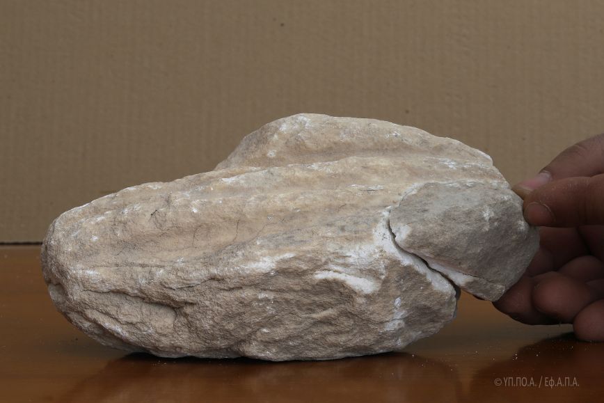 Το εν λόγω θραύσμα, εξαιρετικά διαβρωμένο και με ρηγματώσεις σε όλη του την επιφάνεια, το οποίο, κατά το δημοσίευμα της “Αυγής” κατεστράφη από χρήση κομπρεσέρ, επλήγη κατά τις εργασίες που έγιναν χειρωνακτικά, αποκλειστικά και μόνο με τη χρήση αξίνας και φτυαριού.