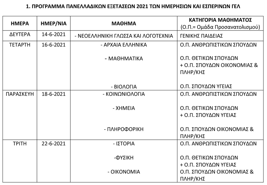 Το πρόγραμμα των πανελλαδικών εξετάσεων Γενικών Λυκείων και Επαγγελματικών Λυκείων 2021 ανακοίνωσε το Υπουργείο Παιδείας και Θρησκευμάτων, όπως αυτό καθορίστηκε με σχετικές Υπουργικές Αποφάσεις.