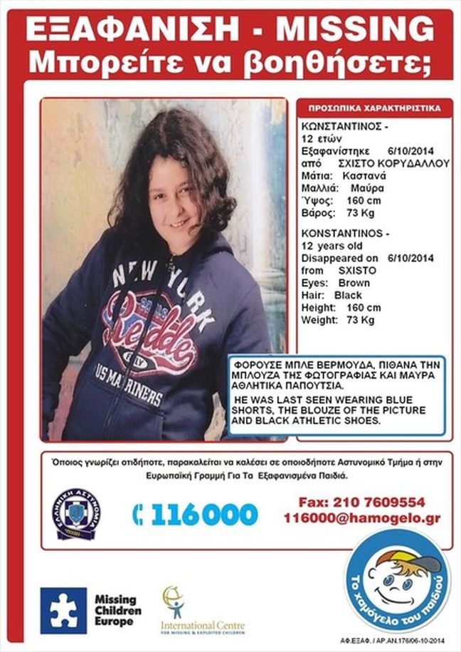 Οποιοδήποτε γνωρίζει κάτι παρακαλείται να επικοινωνήσει με την Αστυνομία (100) ή να καλέσει τον αριθμό 116000.