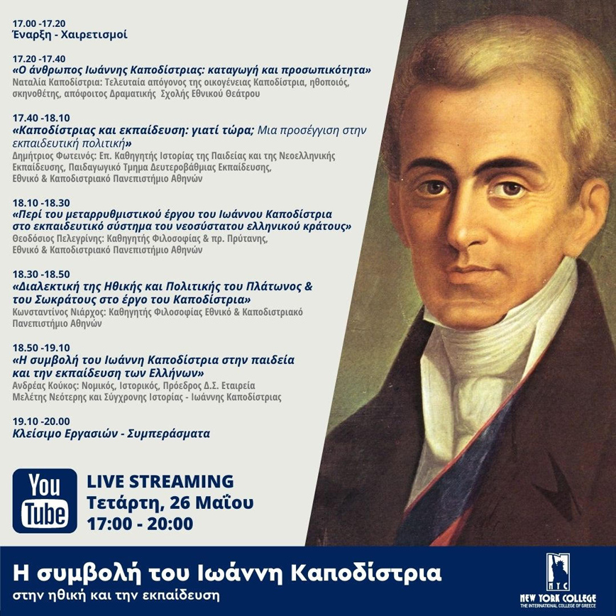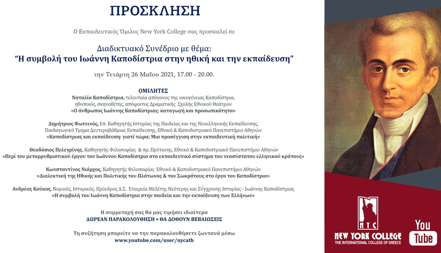 Το Νew York College τιμώντας την επέτειο των 200 χρόνων από την Επανάσταση του 1821 και σε συνέχεια της χορηγίας για την εκτύπωση και αποστολή του βιβλίου «Η περί παιδείας παρακαταθήκη του Ιωάννη Καποδίστρια» στις σχολικές μονάδες της χώρας, οργανώνει την Τετάρτη 26 Μαΐου 2021 και ώρα 17.00-20.00 διαδικτυακό επιστημονικό συνέδριο με θέμα: “Η συμβολή του Ιωάννη Καποδίστρια στην ηθική και την εκπαίδευση”.