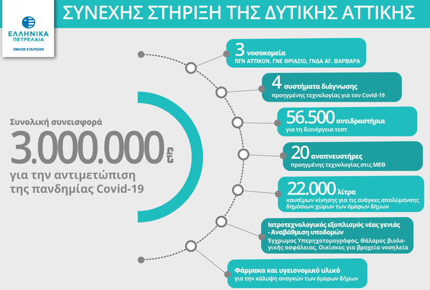 Από την έναρξη της πανδημίας, ο Όμιλος ΕΛΛΗΝΙΚΑ ΠΕΤΡΕΛΑΙΑ έδωσε ιδιαίτερη έμφαση στην κάλυψη αναγκών σε δομές υγείας και πρόνοιας της Δυτικής Αττικής, με τις δωρεές εξοπλισμού και αναλωσίμων προς τους δήμους Ασπροπύργου, Ελευσίνας, Μάνδρας- Ειδυλλίας και Μεγαρέων, καθώς και προς τα νοσοκομεία «ΑΤΤΙΚΟΝ», «ΘΡΙΑΣΙΟ», «Η ΑΓΙΑ ΒΑΡΒΑΡΑ» να ανέρχονται στα 3.000.000 ευρώ.