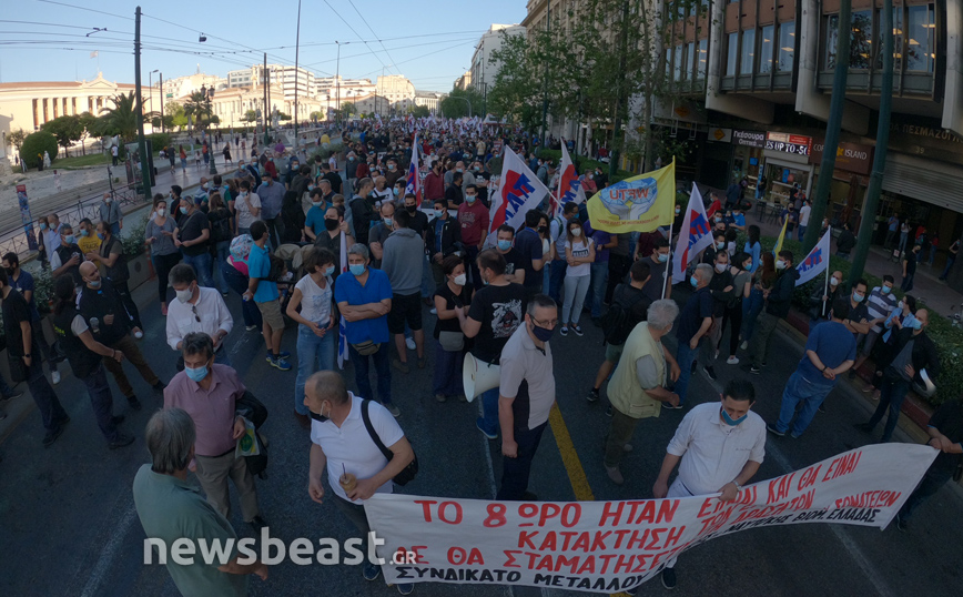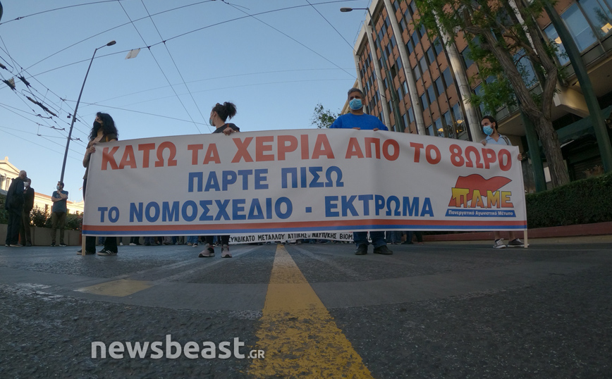 Οι συγκεντρωμένοι διαμαρτύρονται για το νομοσχέδιο του υπουργείου Εργασίας και ζητούν την απόσυρσή του, όπως και τη μη κατάργηση του 8ώρου.
