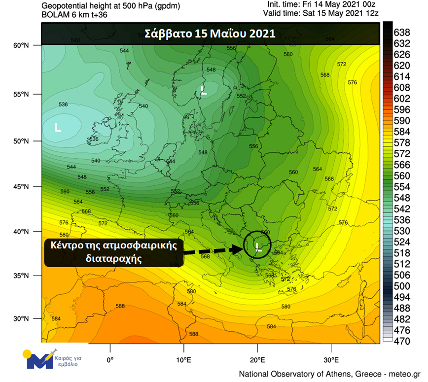 Στην Εικόνα 1 παρουσιάζεται η θέση της ατμοσφαιρικής διαταραχής το μεσημέρι του Σαββάτου 15/05.