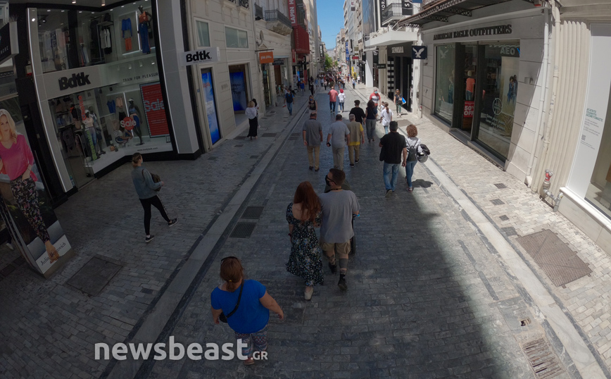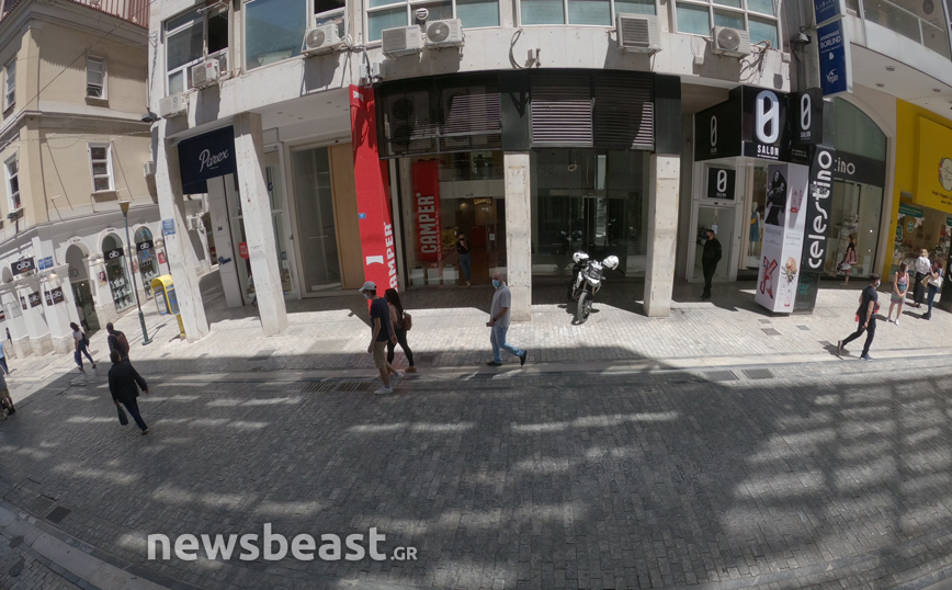 Στην οδό Ερμού, οι υπεύθυνοι των μεγάλων καταστημάτων αντιμετωπίζουν την καινούργια κατάσταση με αισιοδοξία, φροντίζοντας ταυτόχρονα για την τήρηση των αποστάσεων λόγω των περιορισμών κατά του κορονοϊού.