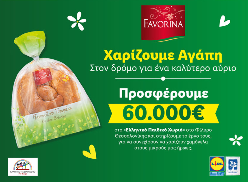 Η Lidl Ελλάς στάθηκε δίπλα στους συνανθρώπους μας που το έχουν πραγματικά ανάγκη και τη φετινή, άκρως διαφορετική και δύσκολη, πασχαλινή περίοδο. Έτσι, από τις 19 Απριλίου και μέχρι εξαντλήσεως των αποθεμάτων, το αργότερο έως τις 2 Μαΐου, με κάθε αγορά συσκευασίας «Πασχαλινό Τσουρέκι Favorina» αξίας 1,99€, η εταιρεία πρόσφερε 0,40€ στο «Ελληνικό Παιδικό Χωριό» στο Φίλυρο Θεσσαλονίκης, συγκεντρώνοντας το ποσό των 60.000€.