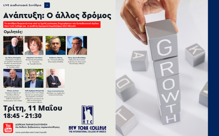 ην 11η Μαΐου 2021 η Σχολή Διοίκησης Επιχειρήσεων του Εκπαιδευτικού Ομίλου New York College και το Διεθνές Εμπορικό Επιμελητήριο (ICC Hellas) πραγματοποίησαν Διαδικτυακό Συνέδριο με θέμα «Ανάπτυξη: ο άλλος δρόμος» με τη συμμετοχή διακεκριμένων εκπροσώπων της ακαδημαϊκής κοινότητας, αλλά και της πολιτικής ζωής της χώρας μας.