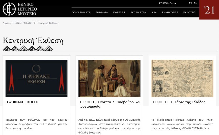 Το ΕΙΜ, στο πλαίσιο των εορτασμών της επετείου των 200 χρόνων, με αφορμή τις αυξανόμενες ανάγκες εξ αποστάσεως επικοινωνίας και με στόχο την προσέγγιση ενός διευρυμένου κοινού, έχει επενδύσει στη βελτίωση της ψηφιακής του εικόνας. Η αφήγηση της κεντρικής έκθεσης του επετειακού προγράμματος ΕΠΑΝΑCΥΣΤΑΣΗ ‘21, πλαισιώνεται από πλούσιο οπτικοακουστικό υλικό και διαδραστικά ψηφιακά εκθέματα. Μέσω της αλληλεπίδρασής του με αυτά, ο επισκέπτης έχει τη δυνατότητα να προσεγγίσει τον τρόπο ζωής, τα γεγονότα, τον οπλισμό του Αγώνα και τον επαναστατικό Τύπο, επιλέγοντας ο ίδιος, ανάμεσα σε πλήθος πληροφοριών, το αντικείμενο του ενδιαφέροντος του. Επίσης το διαδραστικό έκθεμα της «Χάρτας του Ρήγα», προσφέρει μια τεκμηριωμένη και εύληπτη προσέγγιση της περιόδου του Νεοελληνικού Διαφωτισμού.