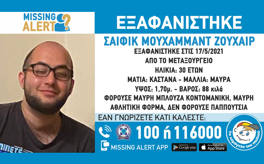 Συναγερμός έχει σημάνει για την εξαφάνιση ενός 30χρονου άνδρα σήμερα Τρίτη (18/5) από την περιοχή του Μεταξουργείου. Πρόκειται για τον Σαϊφίκ (επ.) Μουχαμμάντ Ζουχαίρ (ον.).