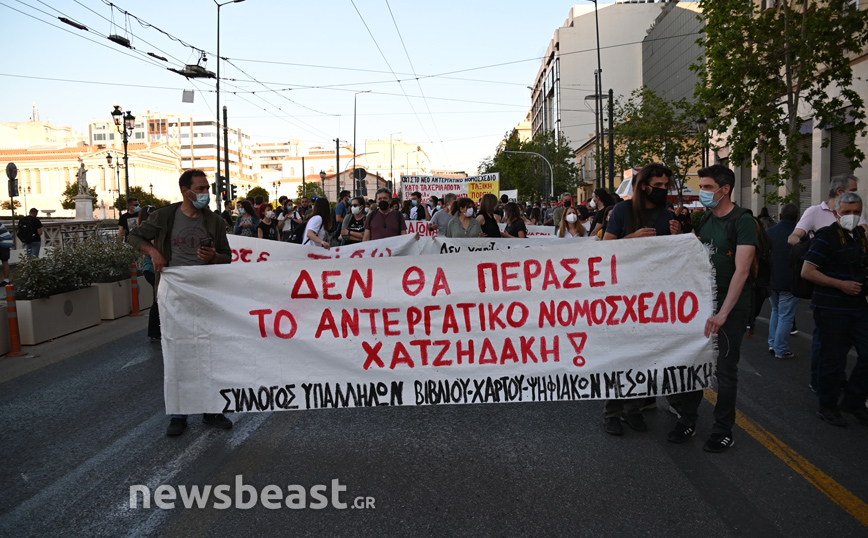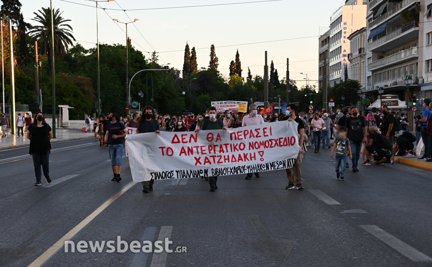 Σχεδόν 1.000 διαδηλωτές ξεκίνησαν την πορεία τους από τα Προπύλαια προς τη Βουλή και κρατούν πανό κατά του νέου νομοσχεδίου για τα εργασιακά.