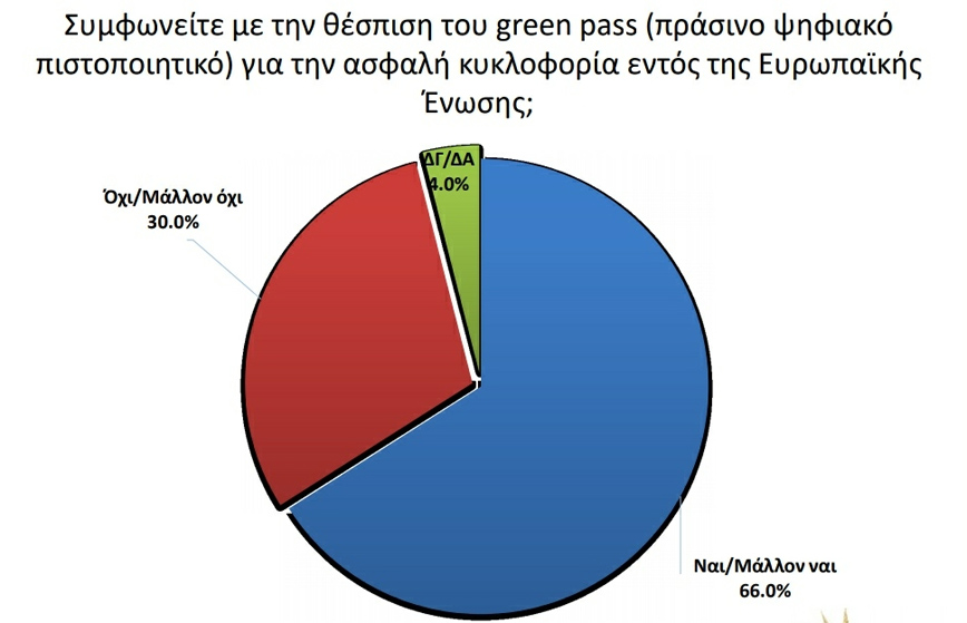 Υπέρ της θέσπισης του πράσινου ψηφιακού πιστοποιητικού (Green Pass) εμφανίζεται το 66% των ερωτηθέντων καθώς και της άρσης της πατέντας των εμβολίων (58%).