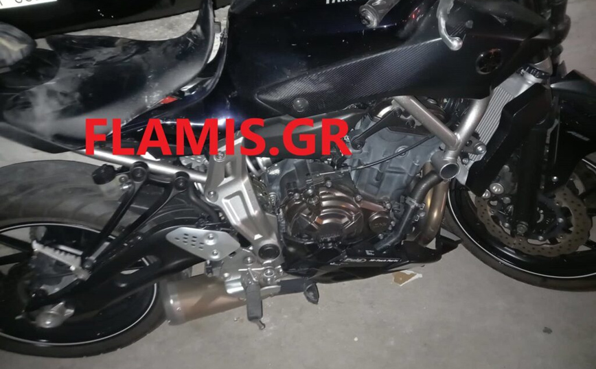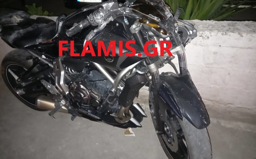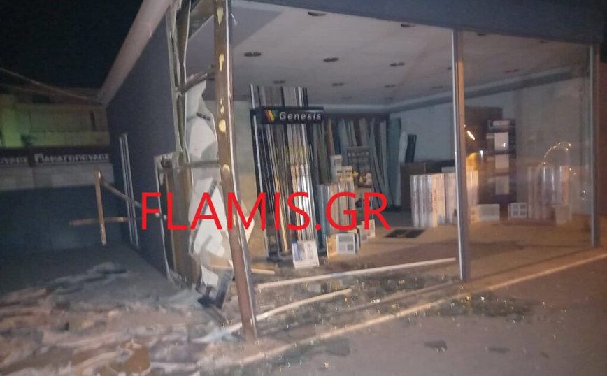 Η μηχανή έσπασε την τζαμαρία και μπήκε μέσα στο κατάστημα, σύμφωνα με το flamis.gr.