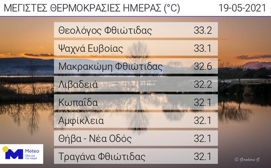 Οι υψηλότερες μέγιστες τιμές καταγράφηκαν στο Θεολόγο Φθιώτιδας (33,2 βαθμοί Κελσίου) και στα Ψαχνά Ευβοίας (33,1 βαθμοί) σύμφωνα με το δίκτυο των αυτόματων μετεωρολογικών σταθμών του Εθνικού Αστεροσκοπείου Αθηνών/meteo.gr.