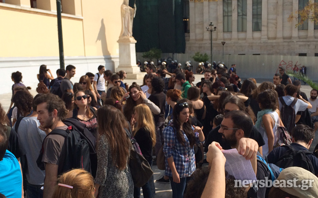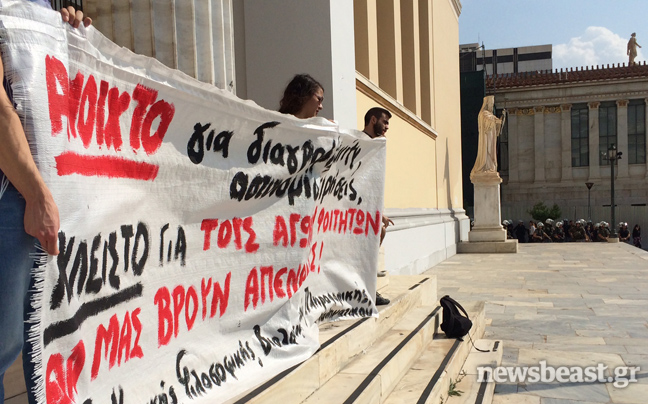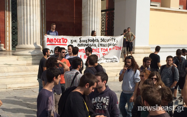 Συγκέντρωση διαμαρτυρίας στα Προπύλαια πραγματοποιούν αυτή την ώρα φοιτητές που αντιδρούν στην απόφαση του νέου πρύτανη του ΕΚΠΑ, Θεόδωρου Φορτσάκη, για φύλαξη των χώρων του πανεπιστημίου από εταιρείες σεκιούριτι, αλλά και στις διαγραφές φοιτητών.