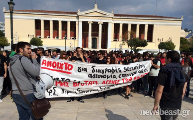 Οι φοιτητές διαμαρτύρονται για την παρουσία ιδιωτικών εταιρειών σεκιούριτι στα πανεπιστήμια, αλλά και τις διαγραφές φοιτητών.