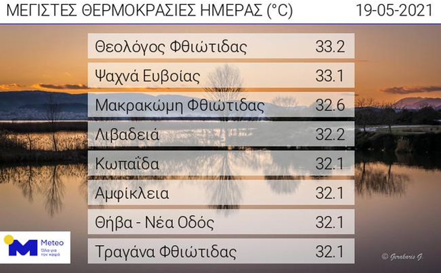 Η υψηλότερη μέγιστη τιμή καταγράφηκε στο Θεολόγο Φθιώτιδας (33,2 βαθμοί Κελσίου). Ακολούθησαν τα Ψαχνά Ευβοίας (33,1) και η Μακρακώμη Φθιώτιδας (32.6).