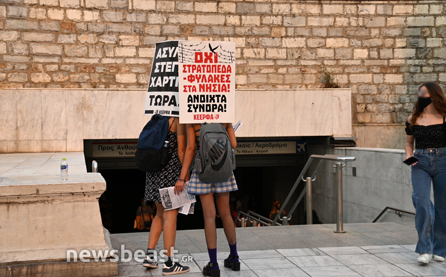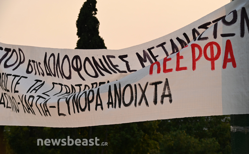 Κρατούν πανό και πλακάτ με συνθήματα «Όχι στα στρατόπεδα – φυλακές στα νησιά», «άσυλο, στέγη, χαρτιά τώρα», «Stop στις δολοφονίες μεταναστών».