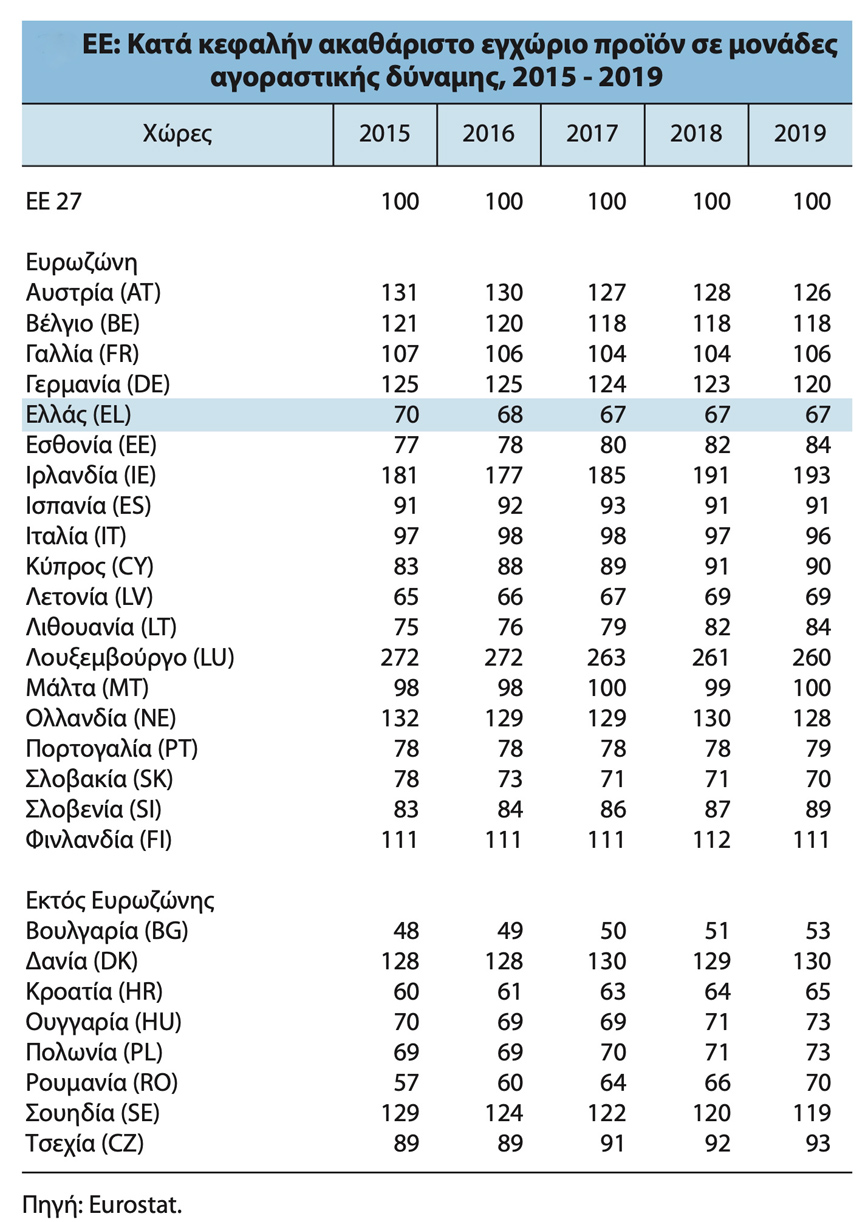 Για να συγκριθεί το Ακαθάριστο Εγχώριο Προϊόν μεταξύ των χωρών, η Eurostat στις συγκρίσεις της χρησιμοποιεί μια τεχνητή νομισματική μονάδα, που καλείται «μονάδα αγοραστικής δύναμης». Μέσω αυτής, καθίσταται δυνατή η σύγκριση της αγοραστικής δύναμης διαφόρων νομισμάτων (άρα εντός και εκτός ευρωζώνης) και μας δίνει μια εικόνα του τί μπορεί να αγοράσει κάθε πολίτης. Έτσι λοιπόν, εάν η μέση αγοραστική δύναμη είναι 100, το έτος 2019 ο Έλληνας είχε μόλις 67 με αποτέλεσμα να είναι ουραγός σε σχέση με όλα τα υπόλοιπα κράτη που έχουν υιοθετήσει το ευρώ. Την ίδια ώρα ο κάτοικος του Λουξεμβούργου έχει… 260, της Ιρλανδίας 193, της Ολλανδίας 128 και της Γερμανίας 120. Είναι χαρακτηριστικό το γεγονός πως ακόμη κι αν συγκριθούμε με κράτη εκτός ευρωζώνης και πάλι η εικόνα είναι απογοητευτική καθώς περνάμε μόνο την Κροατία (65) και τη Βουλγαρία (53).