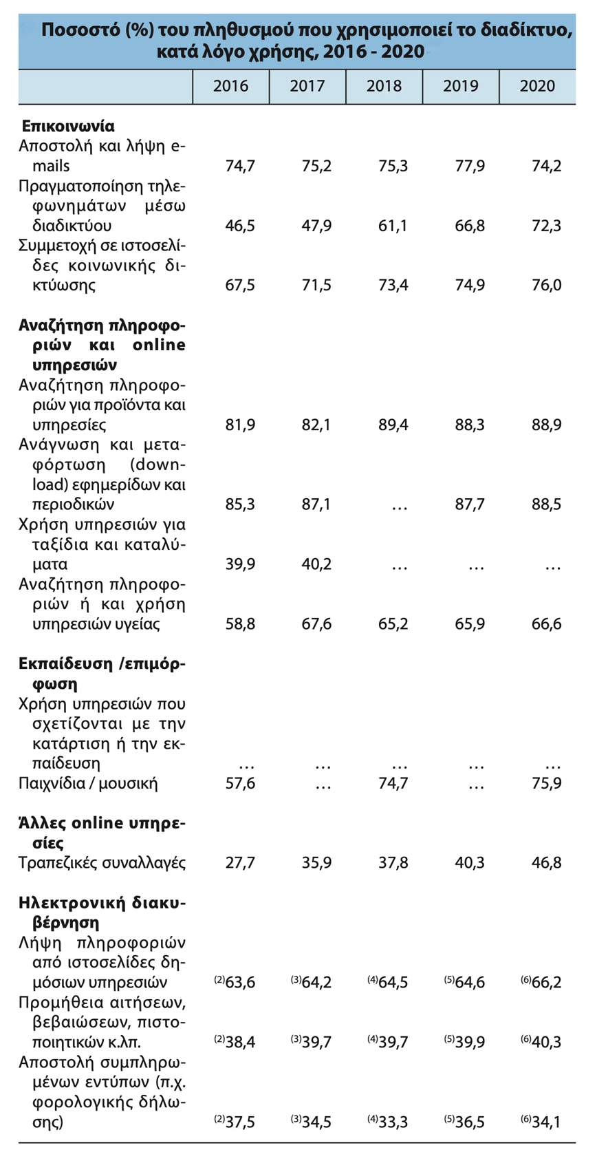 Ακολούθως, το 76% του πληθυσμού συμμετέχει σε ιστοσελίδες κοινωνικής δικτύωσης (κυρίως Facebook), ενώ το 74,2% στέλνει και λαμβάνει emails. Αξιοσημείωτο είναι επίσης το γεγονός ότι το 72,3% των Ελλήνων πραγματοποιεί τηλεφωνήματα μέσω του Διαδικτύου (από τις δωρεάν εφαρμογές του Messenger, του WhatsApp, του Viber, του Skype, κ.λπ.), ενώ το 66,6% αναζητεί πληροφορίες για ζητήματα υγείας ή χρησιμοποιεί σχετικές υπηρεσίες.