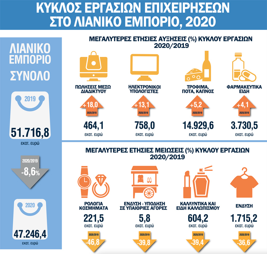 Ο κορονοϊός επηρέασε καταλυτικά τον κλάδο εργασιών των επιχειρήσεων του λιανικού εμπορίου όπως προκύπτει από τις μετρήσεις της ΕΛΣΤΑΤ. Άλλες πλούτισαν και άλλες χρεοκόπησαν ή βρίσκονται στα όρια της χρεοκοπίας λόγω της Covid-19. Ειδικότερα, τις μεγαλύτερες ετήσιες αυξήσεις του κύκλου εργασιών το έτος 2020 σε σχέση με το 2019 είχαν οι επιχειρήσεις που προέβησαν σε πωλήσεις μέσω του Διαδικτύου (e-shop) καθώς είδαν μια αύξηση των πωλήσεων τους της τάξης του 18%, όσοι εμπορεύονταν ηλεκτρονικούς υπολογιστές, τρόφιμα ποτά και καπνό καθώς επίσης και φαρμακευτικά είδη.