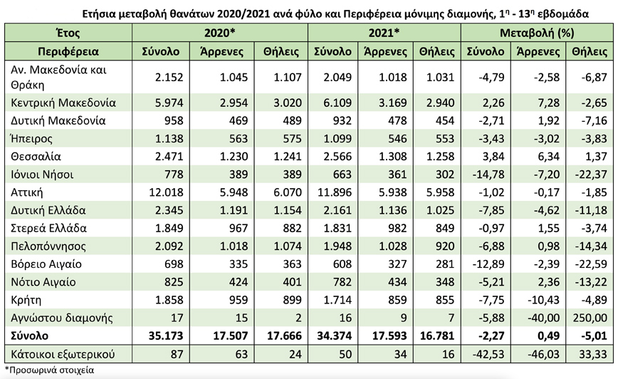 Επίσης, λαμβάνοντας ως κριτήριο την κατά τόπο μόνιμη διαμονή των θανόντων παρατηρείται ότι οι θάνατοι κατά την περίοδο των πρώτων 13 εβδομάδων του έτους 2021 παρουσιάζουν αύξηση σε δύο Περιφέρειες και μείωση σε ένδεκα σε σχέση με τους θανάτους της αντίστοιχης περιόδου του έτους 2020. Η αύξηση, σε απόλυτες τιμές, παρουσιάζεται στις Περιφέρειες Κεντρικής Μακεδονίας και Θεσσαλίας κατά 135 και 95 θανάτους αντίστοιχα και η μεγαλύτερη μείωση στην Περιφέρεια Δυτικής Ελλάδας κατά 184 θανάτους.