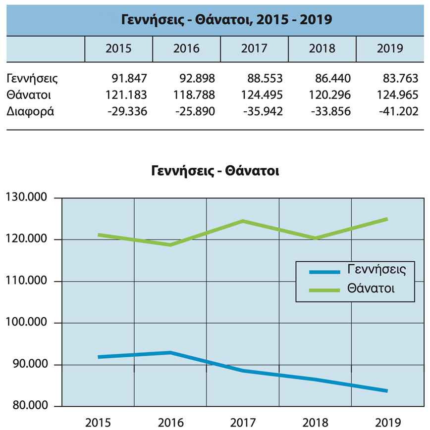 Την ίδια ώρα αυξητική τάση καταγράφουν οι θάνατοι αφού το 2016 είχαμε 118.788, το επόμενο έτος ανέβηκαν στις 124.495, το μεθεπόμενο μειώθηκαν στις 120.296 αλλά το 2019 έφθασαν στις 124.965. Εάν δει κανείς τη διαφορά μεταξύ γεννήσεων και θανάτων, διαπιστώνει ότι το έτος 2016 οι θάνατοι ήταν 25.890 περισσότεροι από τις γεννήσεις, ενώ το 2019 υπερίσχυαν κατά 41.202 δείχνοντας την ξεκάθαρη τάση συρρίκνωσης του πληθυσμού.