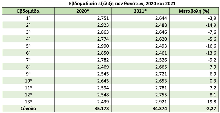 Σύμφωνα με τα στοιχεία αυτά, οι θάνατοι στην Ελλάδα κατά τις 13 πρώτες εβδομάδες του 2021 (4/1/2021 – 4/4/2021) ανήλθαν σε 34.374 (17.593 άνδρες και 16.781 γυναίκες) ενώ κατά τις αντίστοιχες 13 εβδομάδες του 2020 (30/12/2019 – 29/3/2020) είχαν ανέλθει σε 35.173 (17.507 άνδρες και 17.666 γυναίκες), σημειώνοντας λοιπόν μια μείωση της τάξης του 2,27%.