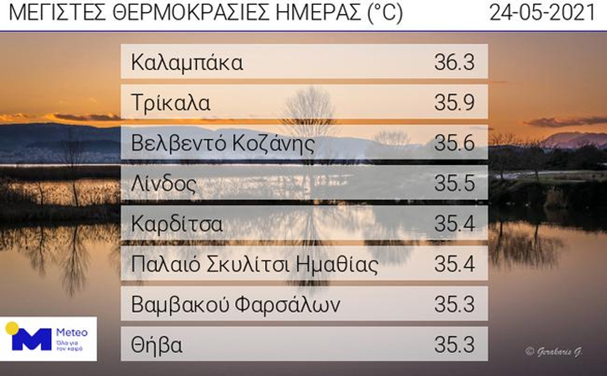 Σε καλοκαιρινά επίπεδα κυμάνθηκε η θερμοκρασία τις μεσημεριανές ώρες της Δευτέρας (24/05) στην Ελλάδα, κυρίως στα κεντρικά τμήματα της χώρας. Η μεγαλύτερη μέγιστη θερμοκρασία καταγράφηκε στην Καλαμπάκα, όπου έφθασε τους 36,3 βαθμούς Κελσίου, ενώ στα Τρίκαλα ήταν 35,9 βαθμοί, σύμφωνα με το δίκτυο των αυτόματων μετεωρολογικών σταθμών του Εθνικού Αστεροσκοπείου Αθηνών / meteo.gr.