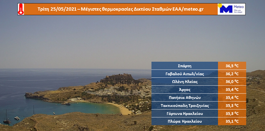 Οι επόμενες μεγαλύτερες μέγιστες θερμοκρασίες καταγράφηκαν στη Γαβαλού Αιτωλοακαρνανίας (36,2), στην Ωλένη Ηλείας (36), στο Άργος (35,4) και στα Πατήσια Αθηνών (επίσης 35,4 βαθμοί).