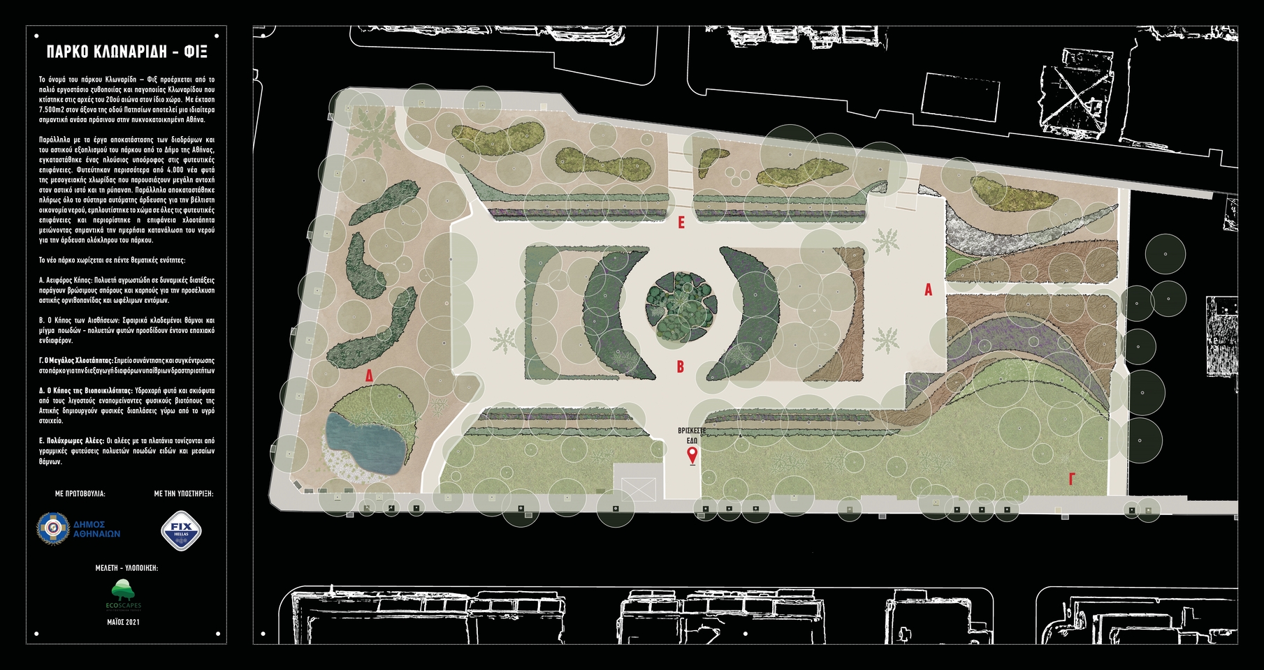 Το πάρκο Κλωναρίδη-Φιξ μας «ξανασυστήνεται» υπό τη νέα του, ριζικώς ανανεωμένη μορφή, ως σύγχρονο αειφόρο αστικό πάρκο, με δομή και φύτευση βάσει των διεθνών τάσεων αρχιτεκτονικής τοπίου και περιβαλλοντικού σχεδιασμού.