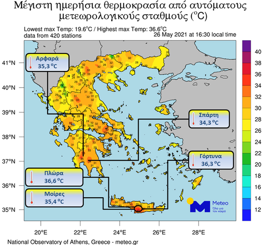 Για ακόμη μια ημέρα πολύ υψηλές για την εποχή θερμοκρασίες σημειώθηκαν τις μεσημεριανές ώρες της Πέμπτης (26/05). Οι υψηλότερες θερμοκρασίες υπήρξαν κυρίως στα νότια τμήματα της χώρας μας, στην Κρήτη και στην Πελοπόννησο, ξεπερνώντας ακόμη και τους 36 βαθμούς.