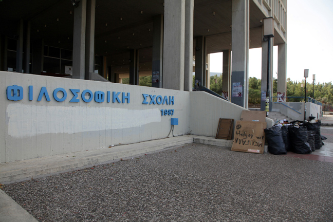 Βγήκαν οι σκούπες στη Φιλοσοφική Σχολή, η οποία δεν έχει καθαριστεί εδώ και μήνες, εξαιτίας της λήξης της σύμβασης του πανεπιστημίου με τον προηγούμενο εργολάβο και την απεργία των καθαριστριών.
