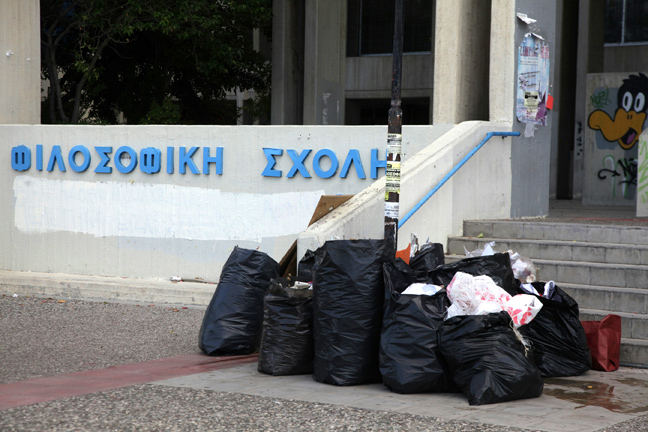 Όσες τουαλέτες λειτουργούν ακόμα, έχουν φρακάρει από τα χαρτιά, ενώ είναι εμφανές από πολλά μέτρα μακριά ότι απολύμανση έχει να γίνει εδώ και καιρό. Στους διαδρόμους σχηματίζονται βουνά από σκουπίδια κάθε είδους. Τα πλαστικά ποτήρια, τα κουτάκια των αναψυκτικών και τα χαρτιά ξεχειλίζουν από τους κάδους, φτάνοντας στο σημείο να εμποδίζουν την είσοδο των φοιτητών στα αμφιθέατρα. Στις αίθουσες είναι παρατημένα δεκάδες ποτήρια με καφέ και μπουκάλια νερού, ενώ και οι φοιτητικές παρατάξεις δείχνουν να αδιαφορούν για την εικόνα του πανεπιστημίου σκορπίζοντας δεκάδες αφίσες στο πάτωμα.