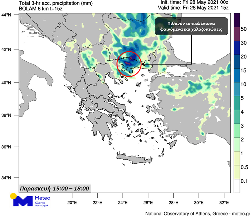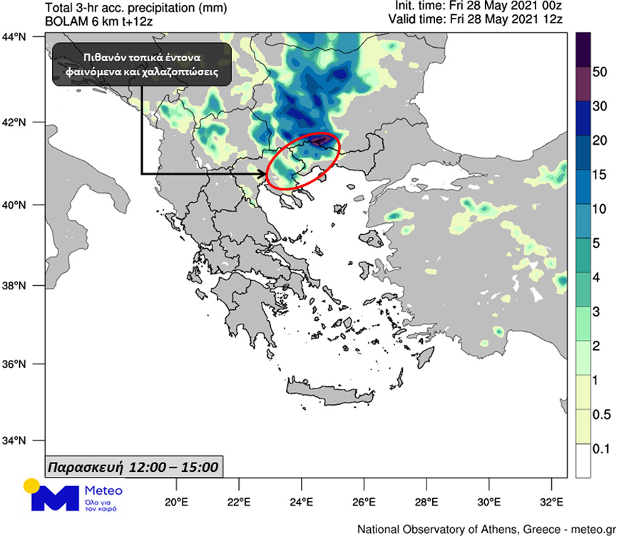 Στους παρακάτω χάρτες παρουσιάζεται το εκτιμώμενο ύψος βροχής για τις μεσημεριανές και απογευματινές ώρες της Παρασκευής 28/05, ενώ επισημαίνονται οι περιοχές όπου αναμένονται τα τοπικά έντονα φαινόμενα.