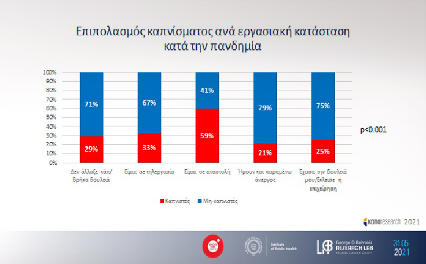 Ωστόσο, ο κ. Μπεχράκης επισήμανε πως «η πανδημία συνδυάζεται με μικρού βαθμού αύξηση επιπολασμού καπνίσματος, ιδίως των περιστασιακών καπνιστών και ιδιαίτερη αύξηση επιπολασμού καπνίσματος στους εργαζόμενους που τέθηκαν σε αναστολή εργασίας» (Πίνακας 2), σύμφωνα με τα στοιχεία έρευνας γνώμης της ΚΑΠΑ research που έγινε σε 1.264 άτομα στις 13 περιφέρειες της χώρας. Η έρευνα έδειξε επίσης ότι υπήρξε μεταβολή της καπνιστικής συμπεριφοράς και του τύπου των χρησιμοποιούμενων καπνικών προϊόντων.