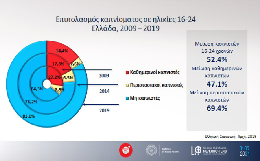 Σημαντική μείωση της χρήσης καπνικών προϊόντων στην Ελλάδα τη δεκαετία 2009-2019, ιδιαίτερα στους νέους, δείχνουν όλα τα στοιχεία που παρουσιάστηκαν απόψε στο αμφιθέατρο του μουσείου της Ακρόπολης, σε ειδική εκδήλωση για την σημερινή Παγκόσμια Ημέρα καπνίσματος, από τον πρόεδρο της Επιτροπής Εμπειρογνωμόνων του Υπουργείου Υγείας για το Κάπνισμα, καθηγητή Παναγιώτη Μπεχράκη παρουσία της Πρόεδρου της Ελληνικής Δημοκρατίας Κατερίνας Σακελλαροπούλου, του υπουργού Υγείας Βασίλη Κικίλια και της υπουργού Παιδείας και Θρησκευμάτων Νίκης Κεραμέως.