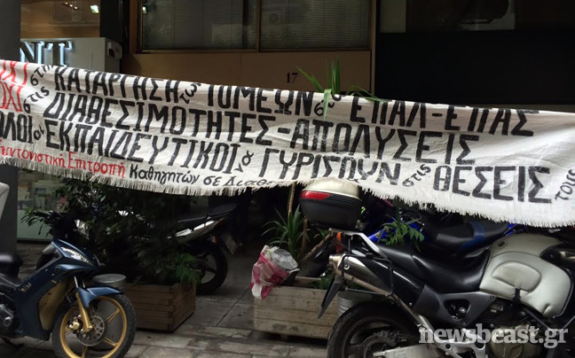 Περίπου 40 άτομα έχουν ανέβει στο γραφείο, ζητούν συνάντηση με τον υπουργό Παιδείας και θέτουν το ζήτημα της άμεσης επίλυσης των αιτημάτων των εκπαιδευτικών.