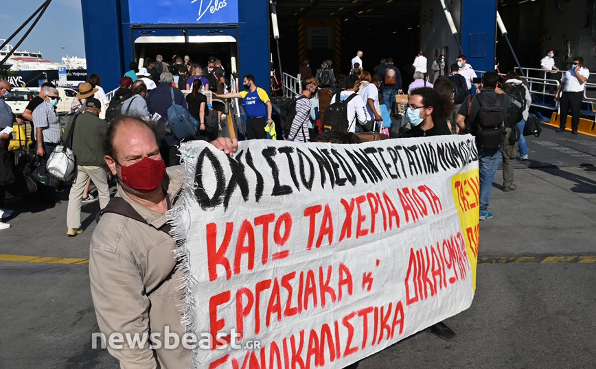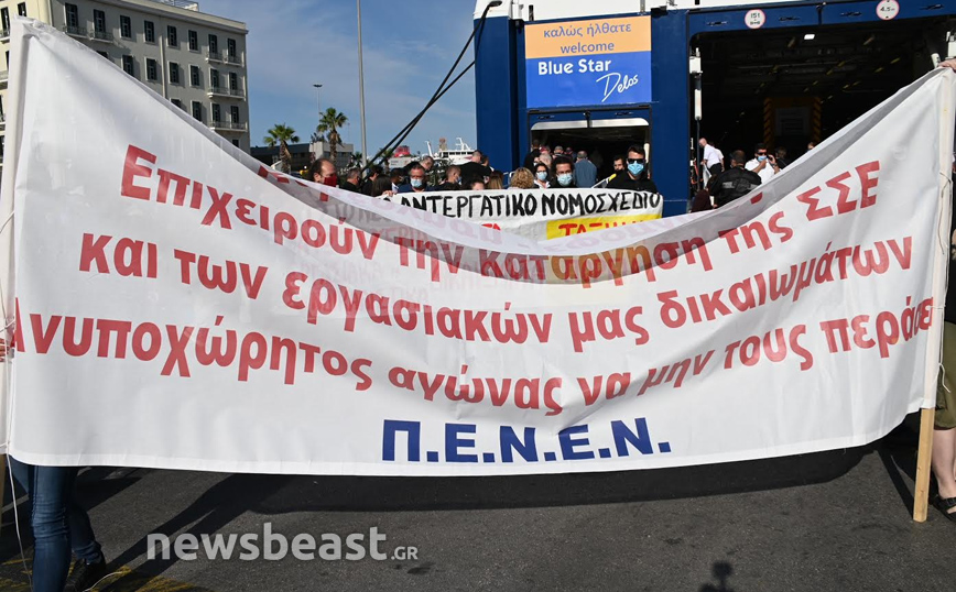 Συγκεντρωμένοι επιβάτες βρίσκονταν από νωρίς το πρωί έξω από το επιβατηγό οχηματαγωγό πλοίο «blue star delos» που ήταν προγραμματισμένο να αναχωρήσει στις 07:25 το πρωί για Θήρα – Πάρο – Νάξο, καθώς μέλη της Πανελλήνιας Ένωσης Ναυτών Εμπορικού Ναυτικού είχαν αποκλείσει την είσοδο του πλοίου πραγματοποιώντας συγκέντρωση διαμαρτυρίας.