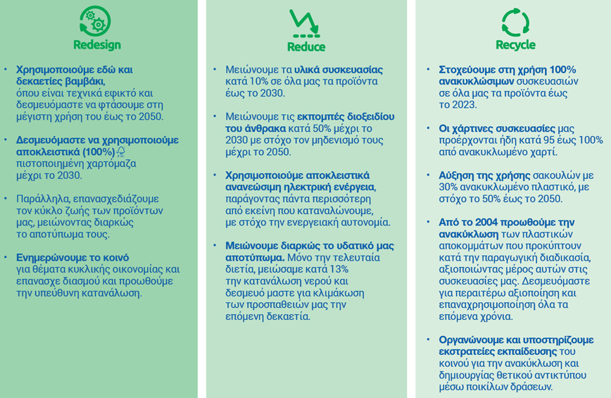 - Με τη χρήση 100% ανακυκλώσιμων συσκευασιών σε όλα της τα προϊόντα έως το 2023.