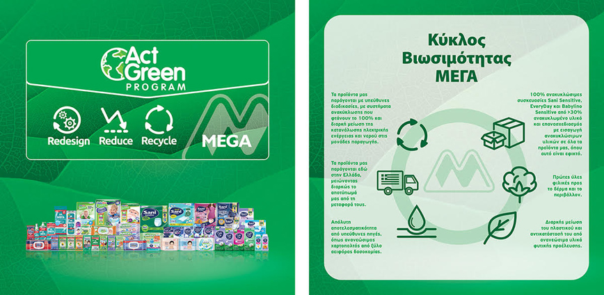 Σήμερα, η 100% ελληνική εταιρεία εντείνει περαιτέρω τις διαχρονικές προσπάθειές της για την προστασία του πλανήτη συνεχίζοντας την αδιαπραγμάτευτη πορεία της προς τη βιωσιμότητα. Επιστρατεύει τόσο τη διεθνή, όσο την Ελληνική καινοτομία, που αναπτύσσεται στα εργαστήριά της και θέτει την τεχνογνωσία, τους πόρους και τις συνεργασίες της στην υπηρεσία του πλανήτη, μειώνοντας σημαντικά το περιβαλλοντικό της αποτύπωμα. Η προσπάθεια αυτή αποτυπώνεται στο πρόγραμμα βιωσιμότητας της ΜΕΓΑ ACT GREEN: Redesign – Reduce – Recycle.