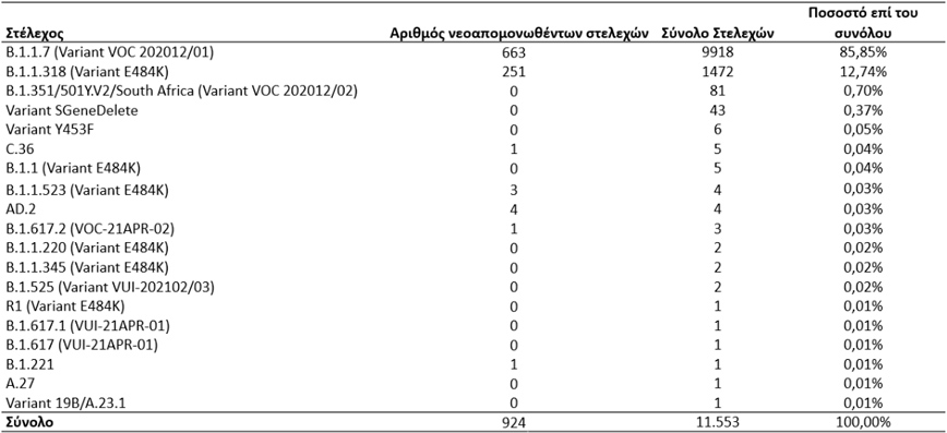 Εκ των 664 δειγμάτων με στελέχη ειδικού ενδιαφέροντος, τα 663 αφορούν στο Β.1.1.7/UK lineage (Variant VOC 202012/01) και 1 αφορά στο B.1.617.2 (VOC-21APR-02), ενώ τα 251 δείγματα με στελέχη VUI αφορούν στο B.1.1.318 (Variant E484K). Επιπλέον, αναδείχθηκαν 3 δείγματα με στέλεχος B.1.1.523 (Variant E484K), 4 δείγματα με στέλεχος AD.2, 1 δείγμα με στέλεχος Β.1.221 και 1 δείγμα με το στέλεχος C.36 (στέλεχος υπό παρακολούθηση, Variant Under Monitoring)